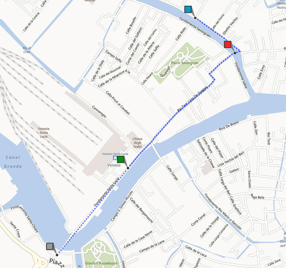 Dal basso all’alto: [label style=”default”]Piazzale Roma[/label] – [label style=”success”]Stazione dei treni[/label] – [label style=”important”]Ponte delle Guglie[/label] – [label style=”info”]Appartamento Bellavista[/label]
